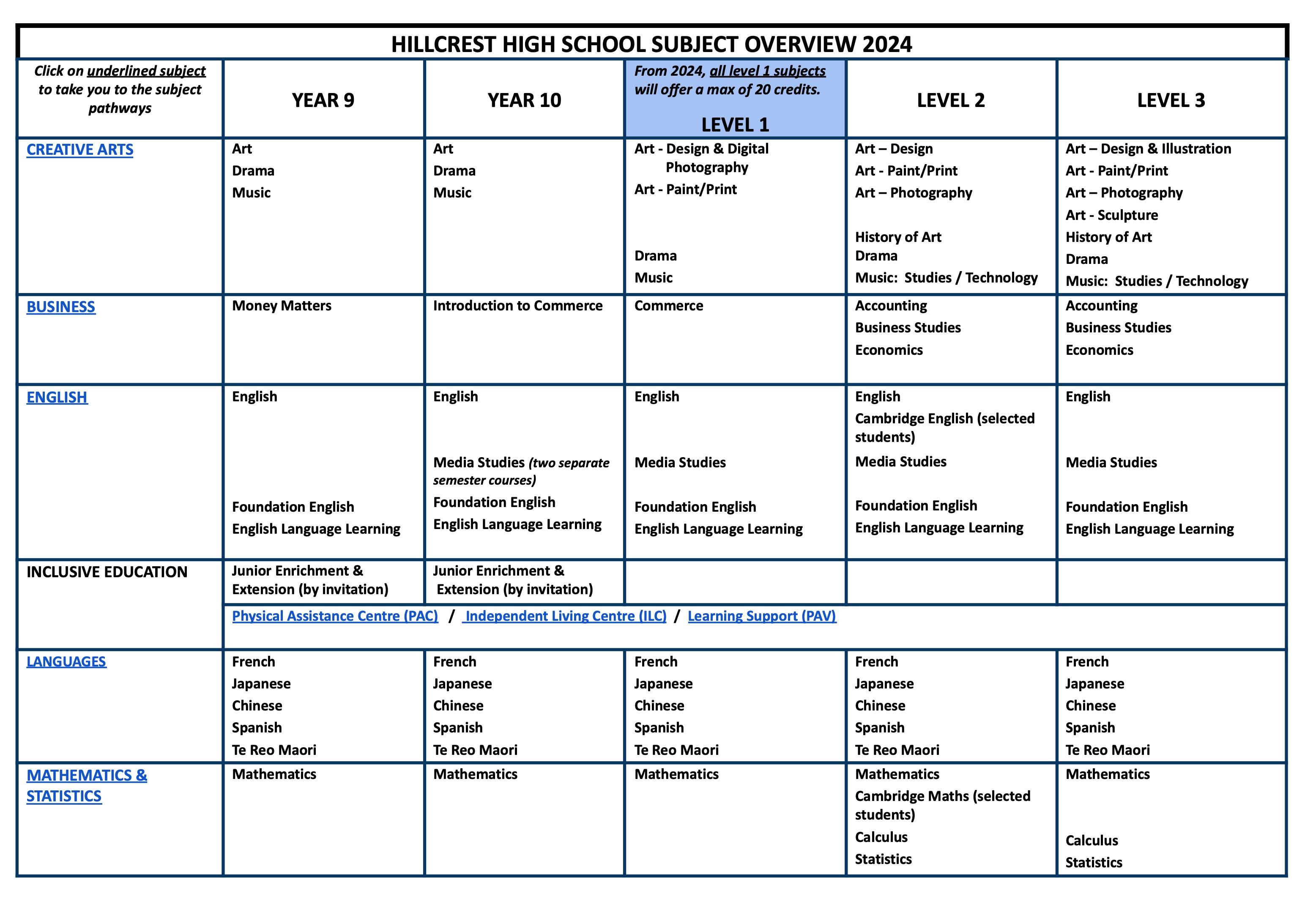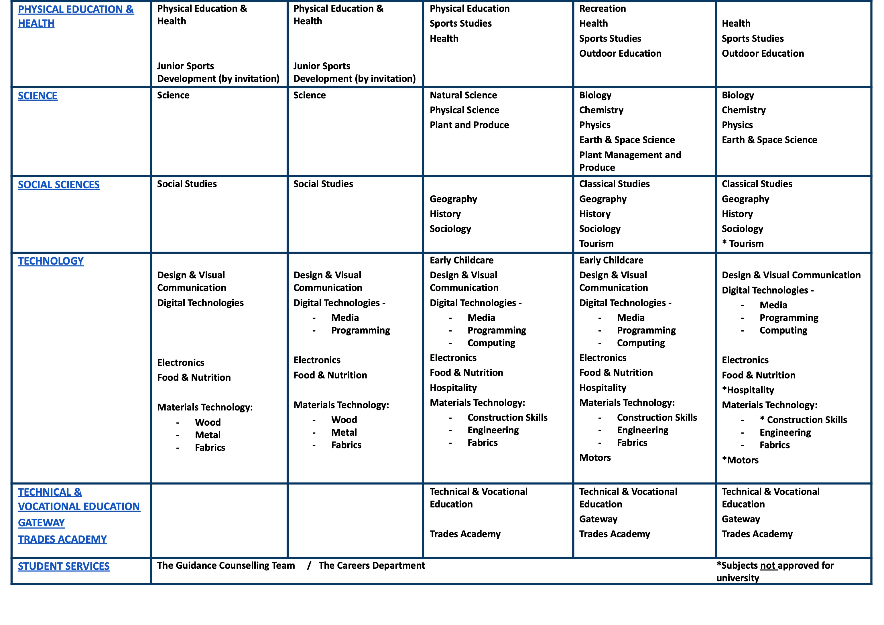 โรงเรียนเปิดสอนในหลักสูตร NCEA โดยมีรายวิชาให้เลือกดังนี้