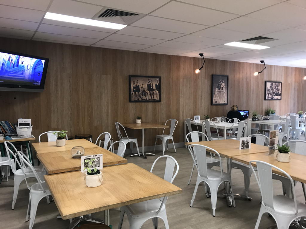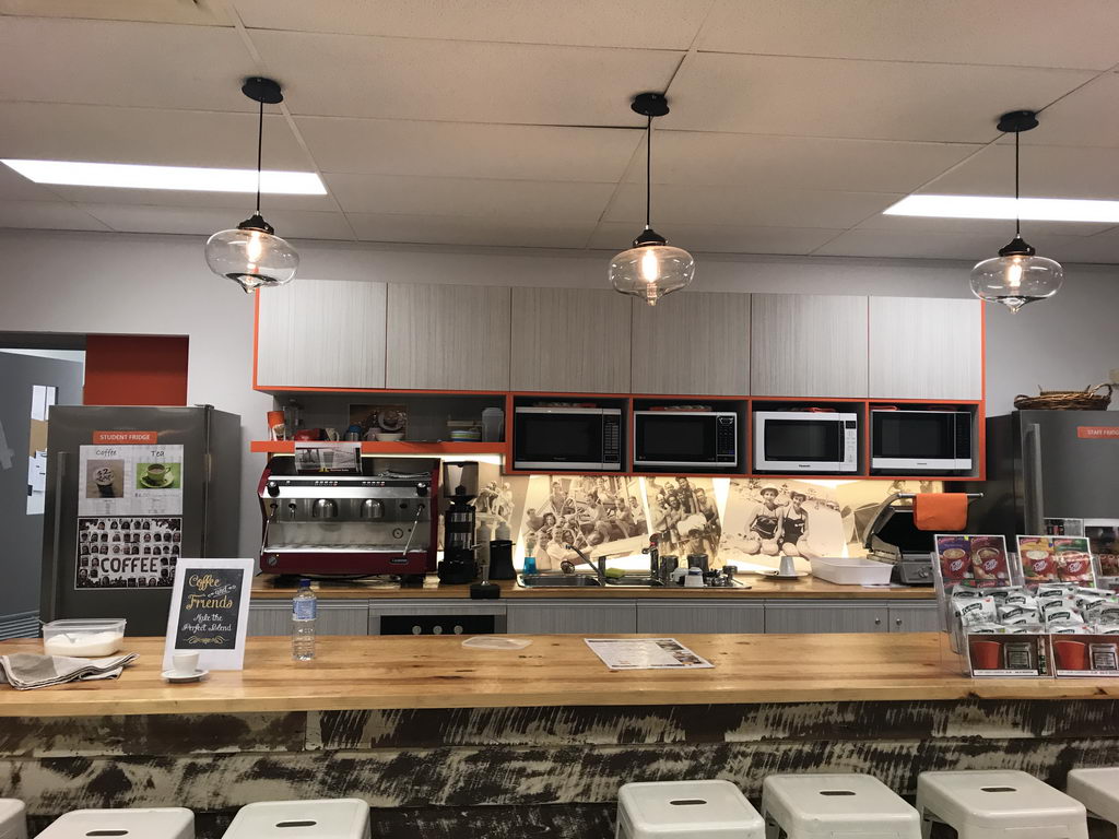 ส่วน common area ที่ตกแต่งสไตล์คาเฟ่ สำหรับให้นักเรียนมานั่งพูดคุย ทานอาหาร ดูทีวี รวมถึงใช้คอมพิวเตอร์กันค่ะ และในบริเวณนี้ยังมีเครื่องชงกาแฟ สำหรับนักเรียนที่ลงเรียนคอร์ส Barista Training ด้วย